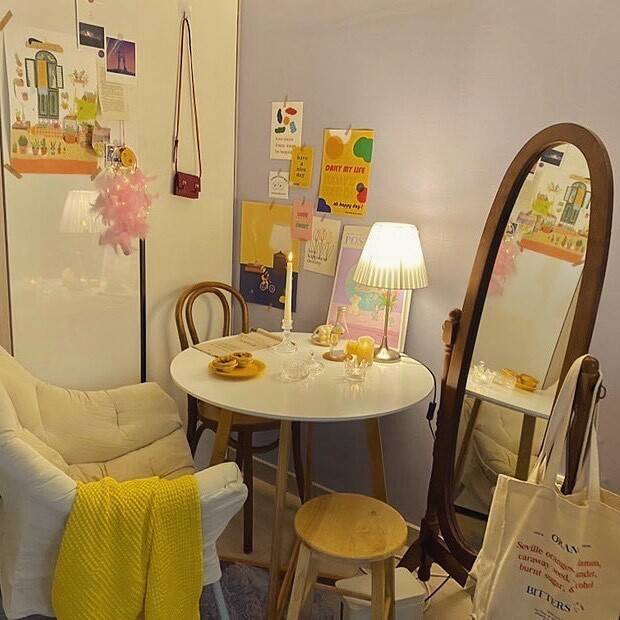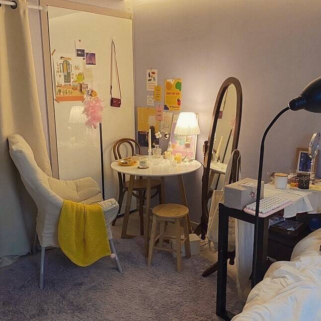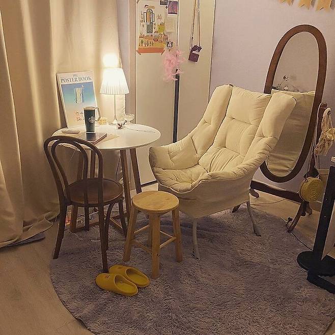 의자 : 체어팩토리 곡목체어 C4657 / 원형테이블 : 앳홈 도리스 원형테이블 / 러그 : 한일카페트 터치미 극세사 러그 / 안락의자 : 캠프밸리 릴렉스 밀란 쇼파 / 전신거울 : 베스트리빙 애슐리 전신거울 / 탁상스탠드 : 마켓비 OMSTAD 단스탠드 E26 / 베개커버 : 마틸라 데일리 프리미엄 베개커버 쥬쥬머스터드