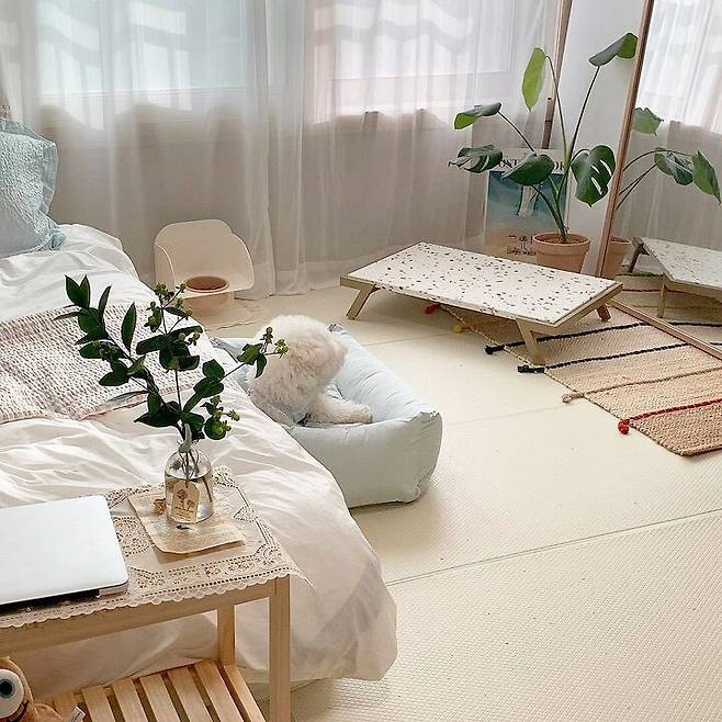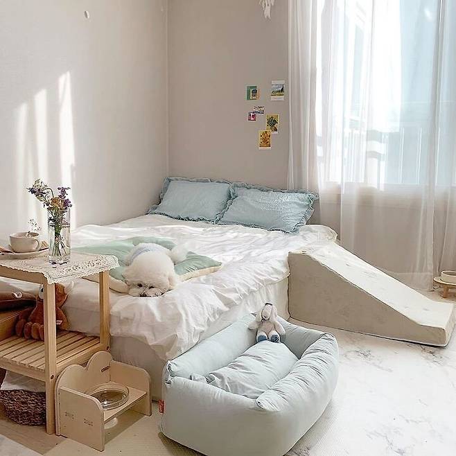 매트 : 눈독들이다 펫 놀이 강아지매트 / 커튼 : 데코뷰 호텔식 화이트 쉬폰 커튼 / 러그 : 이케아 RAKLEV 라클레브 평직러그 / 전신거울 : 노르웨이숲 원목 초대형 전신거울 / 강아지 방석, 쿨매트, 계단 : 아르르 리빙 세트 / 강아지 식기 : 네코이 원목 식빵 식기 1구,아르르 / 강아지 대리석 침대 : 모클래식도그 FELICE Marble Bed Terazzo / 침구 : 데코뷰 베이지 멜란체크 이불&베개커버, 에어룸 60수 아사&시어서커 프릴 베개커버 민트