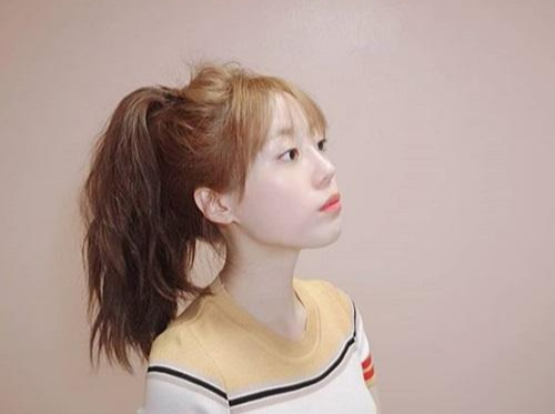 사진 속 허영지는 골지티를 입고 포니테일을 하고 있고요.