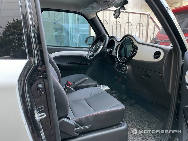 실내 구성은 일반적인 경차와 크게 다르지 않다. 우려와 달리 성인 두 명이 탑승해도 답답하지 않은 공간을 갖췄다. 파워 스티어링 휠이 적용돼 간편한 조향이 가능하며, 다이얼 방식 변속기를 통해 공간 활용성을 높였다. 별도의 주차 모드는 없고, 중립 상태에서 사이드 브레이크를 당기는 방식이다.