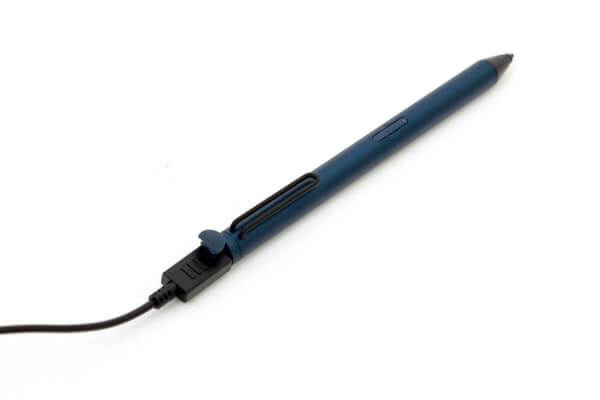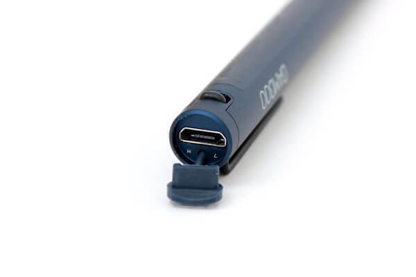 와콤 뱀부 팁의 위쪽 끝부분을 보면 고무로 된 커버가 보인다. 한눈에 보기에도 손톱을 이용해 열 수 있도록 잘린 원형으로 되어있어서 무언가를 덮은 커버임을 쉽게 알 수 있다. 커버를 열면 안쪽에 마이크로 B타입 USB 포트가 있는 것을 확인할 수 있다.