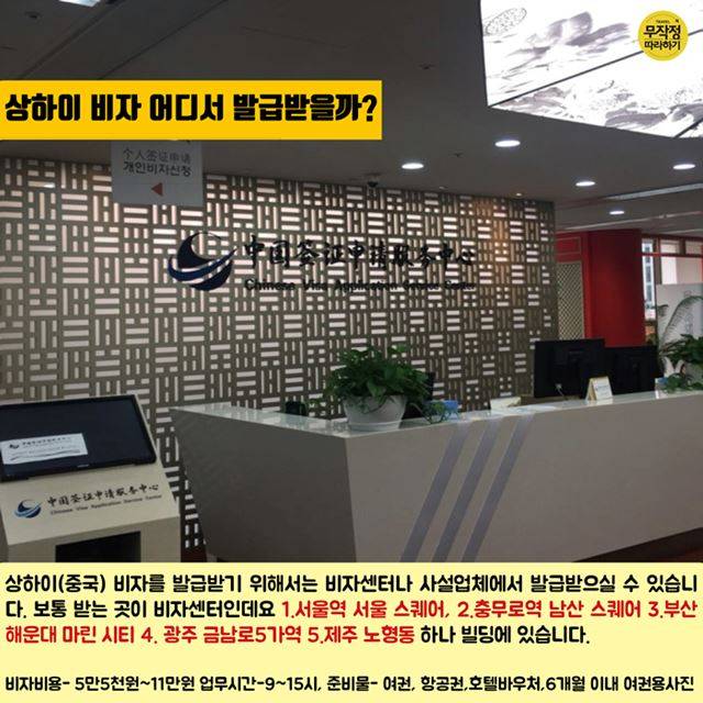 상하이(중국) 비자를 발급받기 위해서는 비자센터나 사설업체에서 발급받으실 수 있습니다. 보통 받는 곳이 비자센터인데요 우리나라에는 1.서울역 서울 스퀘어, 2.충무로역 남산 스퀘어 3.부산 해운대 마린 시티 4. 광주 금남로5가역 5.제주 노형동 하나 빌딩에 있습니다.