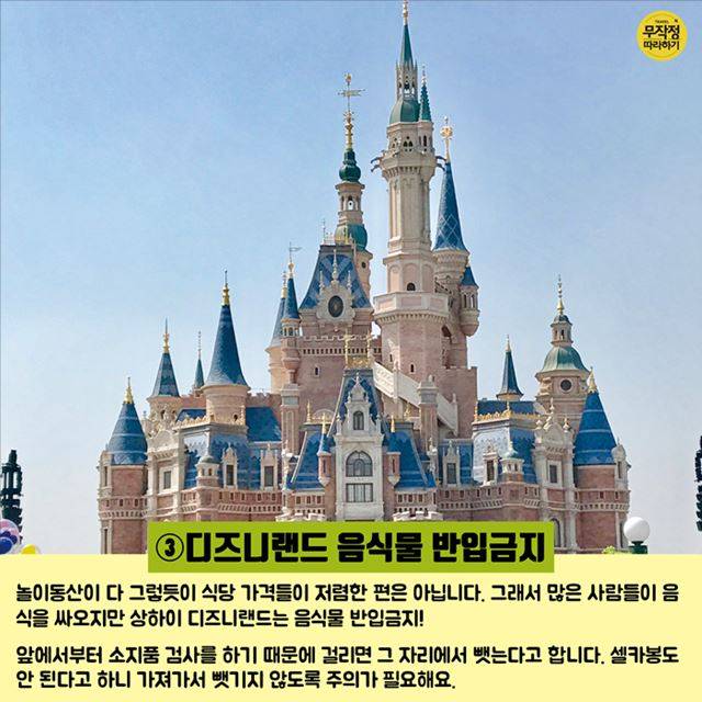 놀이동산이 다 그렇듯이 식당 가격들이 저렴한 편은 아닙니다. 그래서 많은 사람들이 음식을 싸오지만 상하이 디즈니랜드는 음식물 반입금지! 앞에서부터 소지품 검사를 하기 때문에 걸리면 그 자리에서 뺏는다고 합니다. 셀카봉도 안 된다고 하니 가져가서 뺏기지 않도록 주의가 필요해요.