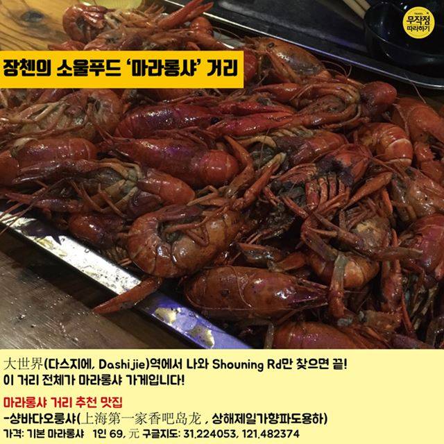 영화 <범죄도시>의 악랄한 보스 '장첸'이 야무지게 먹던 그 음식, 그 음식이 바로 마라롱샤입니다! 마라롱샤는 가재요리인데요. 마라(麻辣): 매운, 롱샤(龙虾): 가재로 말 그대로 매운 가재입니다. 한국에서는 그렇게 비싸다고 합니다. 상하이에서는 싸게 먹을 수 있다는 점~!
