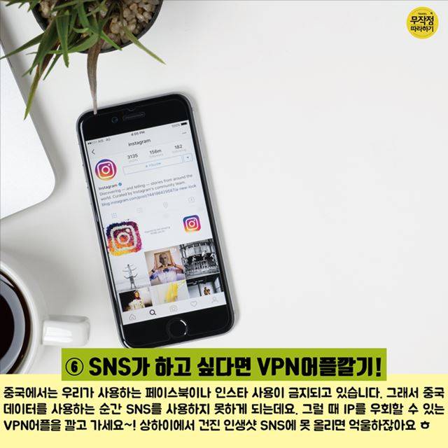 중국에서는 우리가 사용하는 페이스북이나 인스타 사용이 금지되고 있습니다. 그래서 중국데이터를 사용하는 순간 SNS를 사용하지 못하게 되는데요. 그럴 때 IP를 우회할 수 있는 VPN어플을 깔고 가세요~! 상하이에서 건진 인생샷 SNS에 못 올리면 억울하잖아요 ㅎ