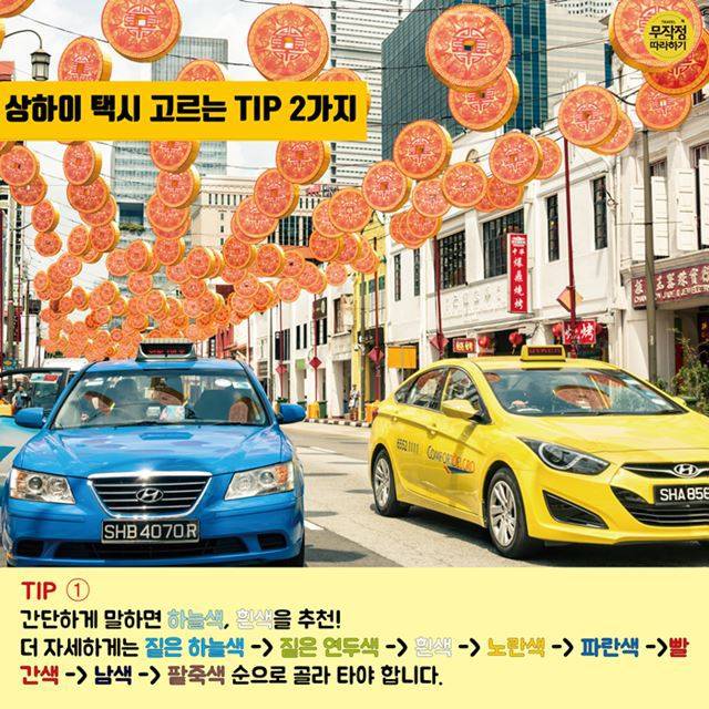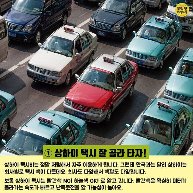 그래서 어떤 택시를 타야 할지 많은 고민을 하게 됩니다. 보통 상하이 택시는 빨간색 NO! 하늘색 OK! 로 알고 갑니다. 빨간색은 확실히 미터기 올라가는 속도가 빠르고 난폭운전을 할 가능성이 높아요.