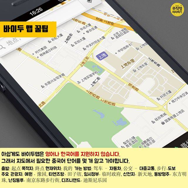 아쉽게도 바이두맵은 영어나 한국어를 지원하지 않습니다. 그래서 지도에서 필요한 중국어 단어를 몇 개 알고 가야합니다.