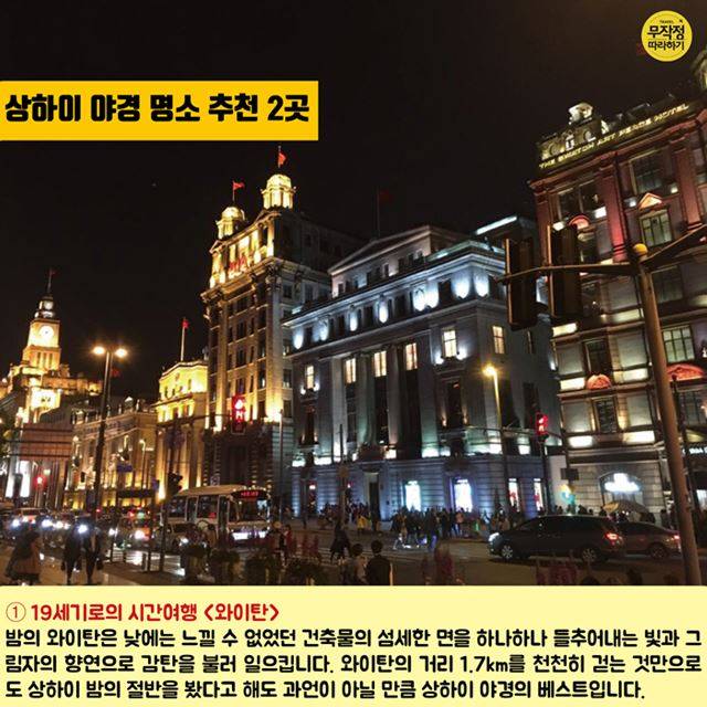 밤의 와이탄은 낮에는 느낄 수 없었던 건축물의 섬세한 면을 하나하나 들추어내는 빛과 그림자의 향연으로 감탄을 불러 일으킵니다. 와이탄의 거리 1.7km를 천천히 걷는 것만으로도 상하이 밤의 절반을 봤다고 해도 과언이 아닐 만큼 상하이 야경의 베스트입니다.