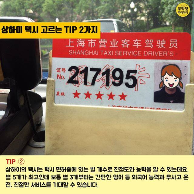 상하이의 택시는 택시 면허증에 있는 별 개수로 친절도와 능력을 알 수 있는데요. 별 5개가 최고인데 보통 별 3개부터는 간단한 영어 등 외국어 능력과 무사고 운전, 친절한 서비스를 기대할 수 있습니다.