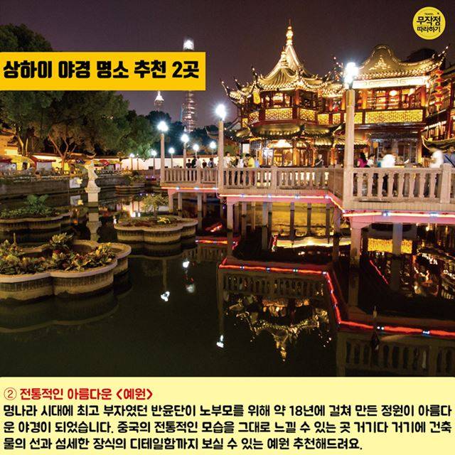 명나라 시대에 최고 부자였던 반윤단이 노부모를 위해 약 18년에 걸쳐 만든 정원이 아름다운 야경이 되었습니다. 중국의 전통적인 모습을 그대로 느낄 수 있는 곳 거기다 거기에 건축물의 선과 섬세한 장식의 디테일함까지 보실 수 있는 예원 추천해드려요.