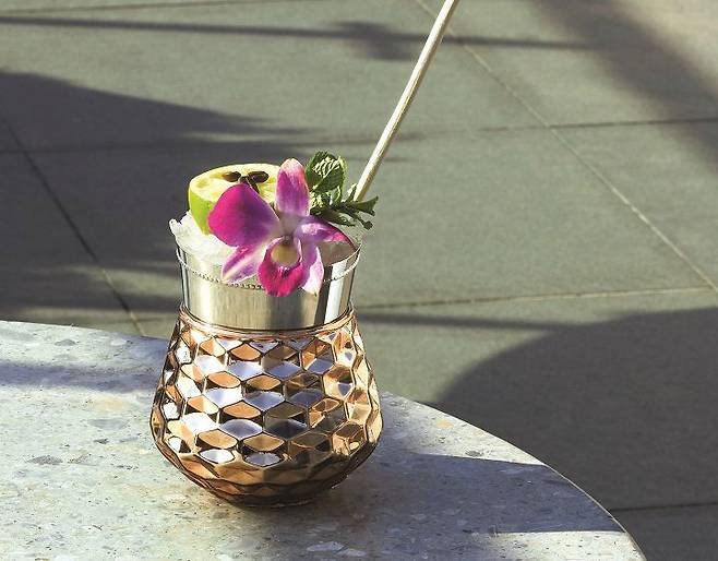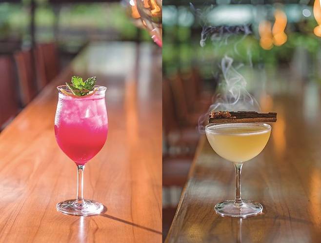 이때 우리 술의 범위를 증류주나 막걸리에 한정시키지 않고 우리 땅에서 만들어진 술이라면 두루 폭넓게 활용한다. 추사애플와인도 그런 우리 술 중 하나로, 새롭게 선보인 ‘폴린비’ 칵테일의 경우 추사애플와인을 베이스 삼은 술로 마누카꿀이 덩어리째 들어가, 사과와 꿀의 달콤함을 흠뻑 느낄 수 있다. 이렇게 직접적으로 우리 술을 사용한 칵테일이 있는가 하면, 한국의 분위기를 구현해낸 칵테일도 있다. 여름을 맞아 만든 ‘썸머’로 열대 과일을 베이스 삼아 통통 튀는 홍대의 여름밤 정취를 표현했다.