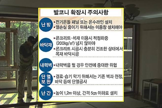 발코니 확장은 2006년 이후 법안이 개정되어 합법화되었다. 현행 건축법상 발코니는 1.5m 이내의 확장 공사가 가능하다. 이 공간이 대피 공간, 스프링클러 구비, 불연성 바닥재 사용 등 안전 조건을 갖추었다면 주거 공간으로 포함하여 사용할 수 있다는 것이다.