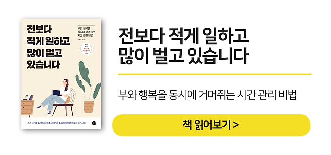시간 부자들은 이미 이 방법으로 적게 일하고, 윤택한 삶을 살고 있습니다. 독자님도 이 중 하나 혹은 둘 이상의 방법으로 시간 부자가 될 수 있습니다.