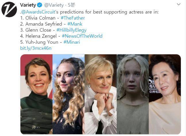 최근 세계적인 영화 매체 버라이어티가 아카데미 관련 특집기사에서 윤여정이 가장 유력한 여우조연상 후보가 될 거라고 예측해 이에 대한 기대감을 더욱 높이고 있다. 만약 그녀가 이번 아카데미 조연상 수상에 성공하게 되면 1957년 <사요나라>의 일본 배우 우메키 미요시 이어 오스카 역사상 조연상을 수상한 두 번째 아시아 여배우가 된다.