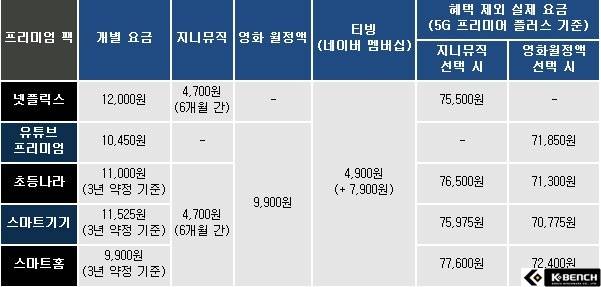 여기에 프리미엄 팩에는 미디어 팩(지니뮤직, 영화 월정액, 생생도서관 중 택 1)이 주어지는데, 지니뮤직을 선택할 시 프리미엄 넷플릭스 팩은 요금제 하나로 OTT 서비스(넷플릭스), 음악 스트리밍(지니 뮤직), TV 서비스(티빙) 모두를 이용하는 셈이다.
