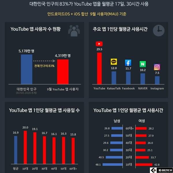 빅데이터 분석 솔루션 모바일인덱스의 조사 결과에 따르면 2020년 9월 기준 유튜브 앱 사용자는 4,319만 명인 것으로 밝혀졌다. 이는 2020년 대한민국 전체 인구의 83%에 해당하는 비율이다. 즉 대한민국 국민 5명 중 4명이 유튜브를 사용하는 것이며, 1인당 월 앱 사용일 수 역시 평균 16.9일로 한달의 반 이상 유튜브를 사용하는 것으로 조사되었다.