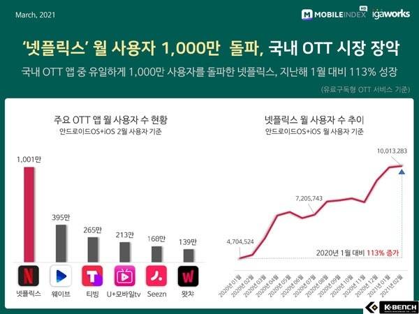 넷플릭스 역시 모바일인덱스의 조사를 확인하면 성장세가 명확하다. 넷플릭스는 2021년 3월 기준 국내 월 사용자가 1,000만이 돌파하였으며, 이는 국내 OTT 서비스 2위인 웨이브에 비해 약 600만 가까이 높은 수치이며 영화OTT로 넷플릭스와 함께 거론되는 왓챠보다는 무려 870만명에 가까운 차이가 나타난다.