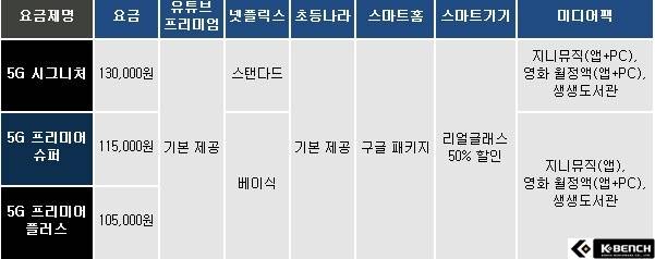 프리미엄팩을 살펴보기 앞서 5G 요금제를 먼저 확인해야 한다. 프리미엄팩은 5G 요금제를 기반으로 만들어진 요금제로, 5G 시그니처, 5G 프리미어 슈퍼, 5G 프리미어 플러스에 추가로 LTE 프리미어 플러스 요금제까지가 프리미엄 팩을 선택 및 사용할 수 있었으며 기존 5G 요금제 가격 그대로 프리미엄 팩을 이용할 수 있다는 게 장점이다.