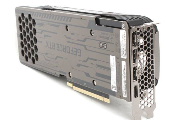 출력 포트는 HDMI 2.1 포트 1개와 DP1.4a 포트 3개로 엔비디아 레퍼런스 포트 구성과 동일하며, 짙은 밤색 느낌으로 도색된 백플레이트는 PCB 후면을 손상으로부터 보호해주는 동시에 쿨러의 무게로 인한 변형을 방지해준다.
