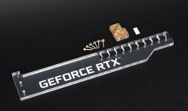한편, 이엠텍 지포스 RTX 3080 블랙 에디션 OC는 그래픽 카드 무게로 인한 메인보드의 PCIe 슬롯이나 그래픽 카드의 PCIe x16 인터페이스 등의 파손 및 변형 방지를 위한 그래픽 카드 지지대가 번들된다.