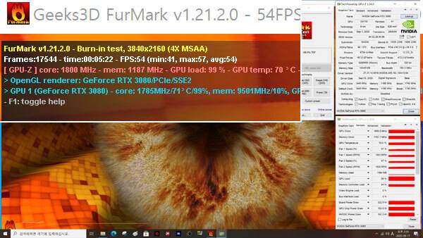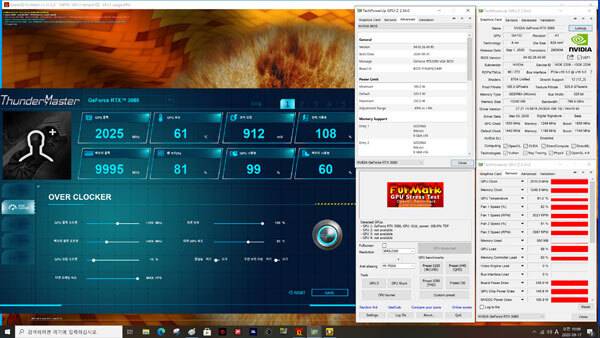 이엠텍 지포스 RTX 3080 블랙 에디션 OC는 해당 세팅으로 퍼마크 부하 테스트 기준 30분을 버텨냈지만, 실제 게임 플레이시에는 불안한 모습을 보였다. 아직 튜닝 유틸리티가 RTX 30 시리즈에 대응하지 못했기 때문인지, 출시 전 배포된 테스트용 그래픽 드라이버 한계인지 현 시점에서는 확실치 않지만, 오버클럭 잠재력을 기대해볼만하다.