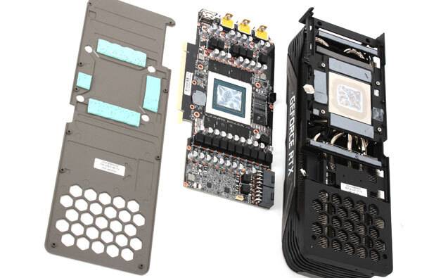 백플레이트는 단순히 PCB 보호를 위한 기능 외에 추가적인 방열판 역할을 위해 써멀패드를 메모리 칩 실장 위치에 덧대었다. 쿨러는 GPU와 메모리, 전원부 DrMOS와 쵸크의 발열을 모두 담당하다록 설계된 모습을 확인할 수 있다.