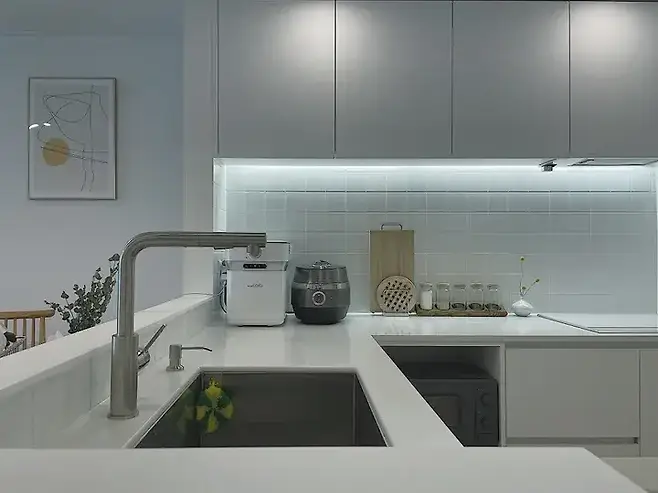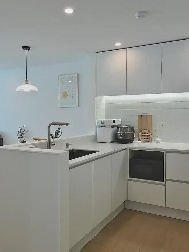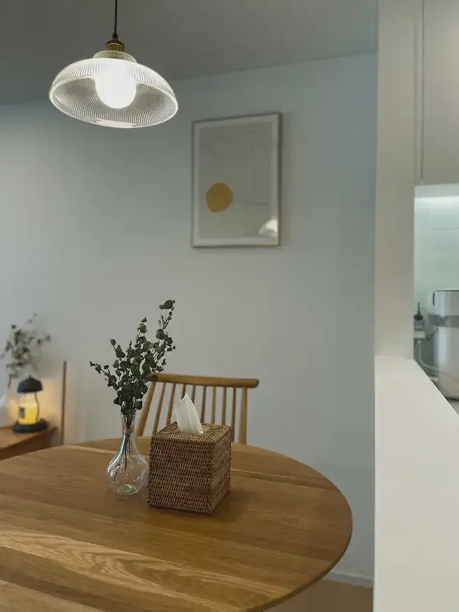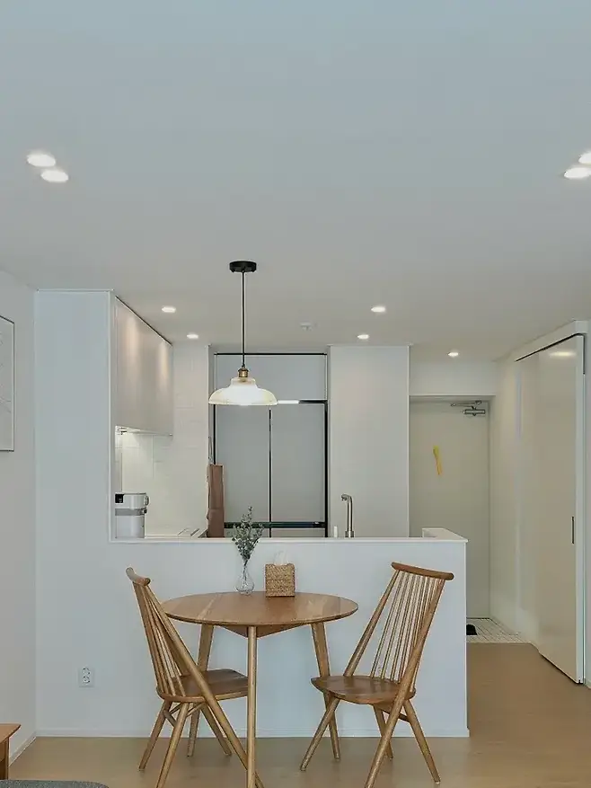 좁은 공간을 넓어보이게 하기 위해 거실 발코니를 확장했고, 거실과 주방 분리에 많은 공을 들였습니다. 거실과 주방 사이에 가벽을 세우고 ㄱ자 조리대로 싱크대를 연장해서 직관적으로 각각의 공간을 연출했어요. ㄱ자 조리대 덕분에 TV나 베란다 바깥을 보며 주방 일을 할 수 있게 되어 주방 일이 무료하지않습니다. 가벽 넘어에는 원형 식탁을 배치해서 식사 공간을 마련하고 홈카페같은 분위기를 연출했습니다.