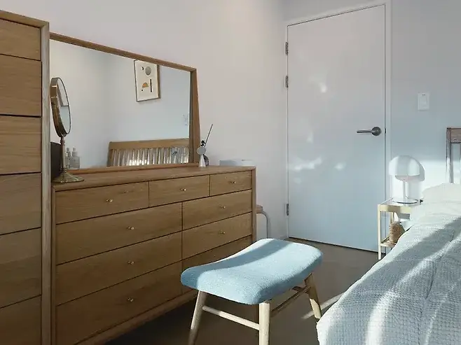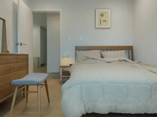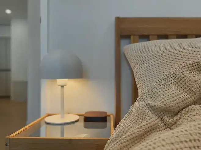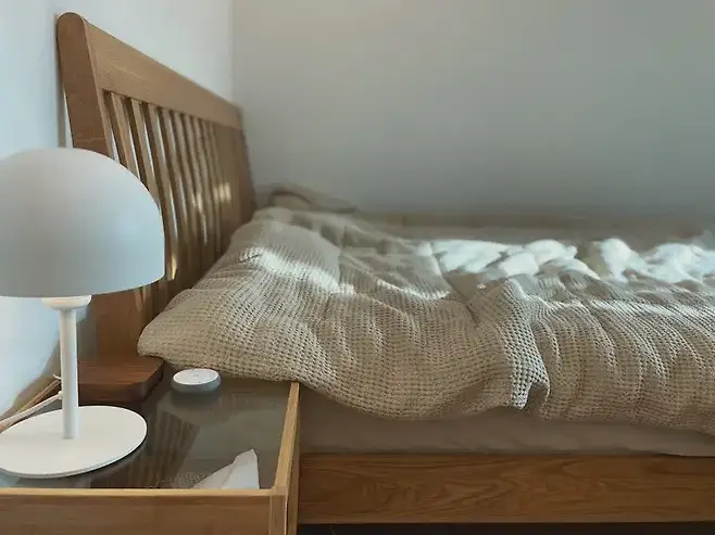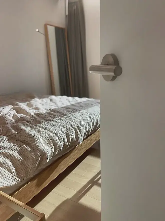 침실은 휴식을 취하는 곳인만큼 편안함과 포근함을 느낄 수 있도록 했습니다. 거실과 전체적인 통일성을 주기 위해 동일한 원목 가구를 사용했고, 유사한 디자인과 원목색을 가진 소품들을 곳곳에 적용했습니다.