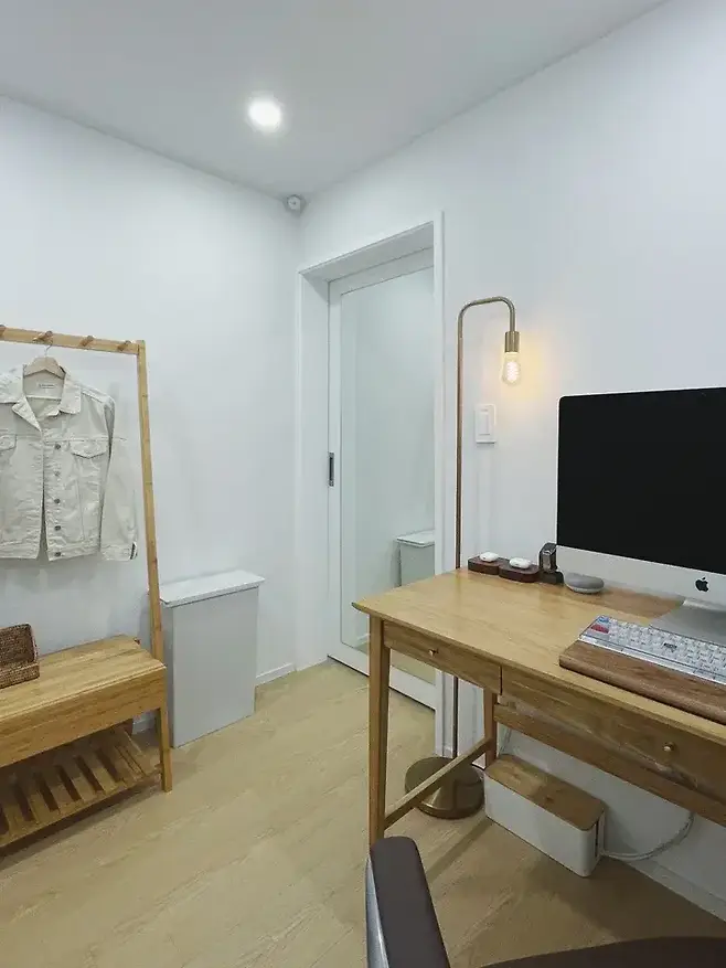 작은 방은 의류 수납과 작업 공간을 조화롭게 넣기 위해 노력했습니다. 한 쪽 벽에 붙박이장을 설치해서 의류 수납 공간을 마련하고, 작업을 위한 책상과 PC를 함께 두었습니다. 작은 방의 공간을 더욱 넓게 쓰기 위해 슬라이딩 도어를 설치했고, 슬라이딩 도어 안 쪽 면에 통유리를 붙여 활용도를 더했습니다.