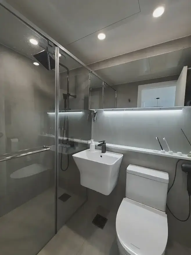 샤워부스는 완전히 분리해서 유리문을 설치했습니다. 세면대쪽으로 물이 튀거나 화장실 전체에 습기가 차는 것을 방지 했고, 건조하고 깔끔한 위생적인 화장실을 유지할 수 있도록 했습니다.