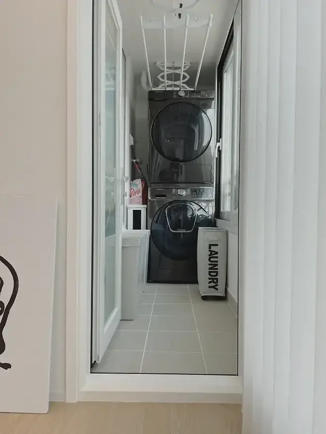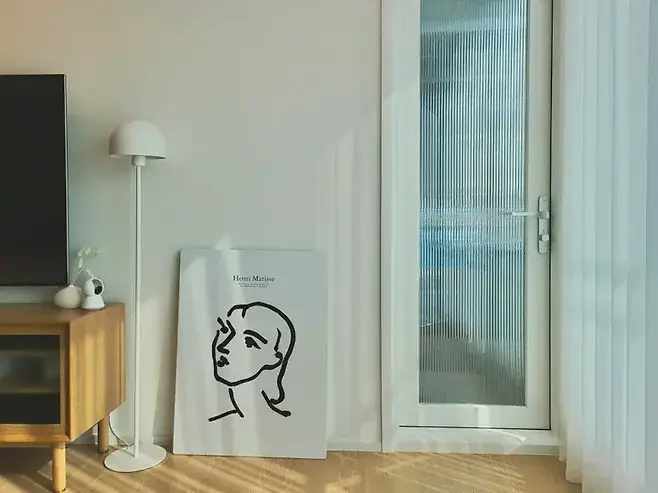 좁은 집을 넓어보이게 하는 데에 가장 큰 역할을 한 공사는 발코니 확장입니다. 확장된 공간인만큼 바닥 열선 공사와 베란다 창호 주변의 단열을 꼼꼼히 신경썼습니다. 세탁실로 통하는 터닝도어에는 일반 유리가 아닌 모루 유리를 사용해서 감성을 더해 넣었습니다. 그리고 그 옆에는 화이트 액자와 조명을 함께 배치해 모루 유리와 화이트 톤이 조화롭게 어울리도록 연출했어요.