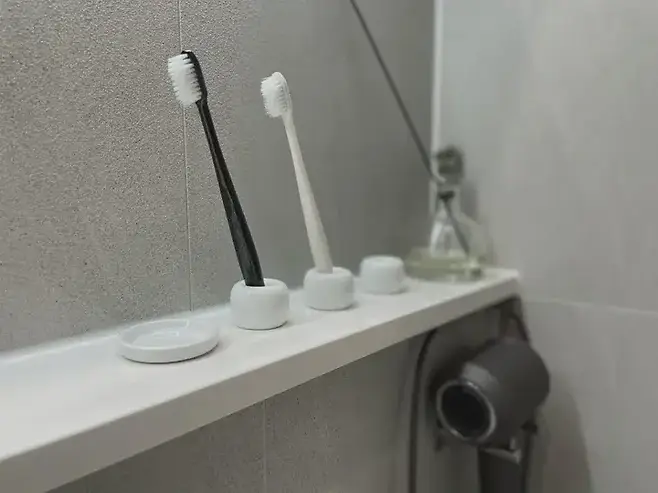 젠다이는 세면대 부터 샤워부스 까지 과감하게 연결하여 마감 했고, 웜 그레이톤의 타일과 잘 어울리는 매트 그레이 수전과 악세사리를 적용해서 전체적인 그레이 톤앤매너를 만들어 냈습니다.