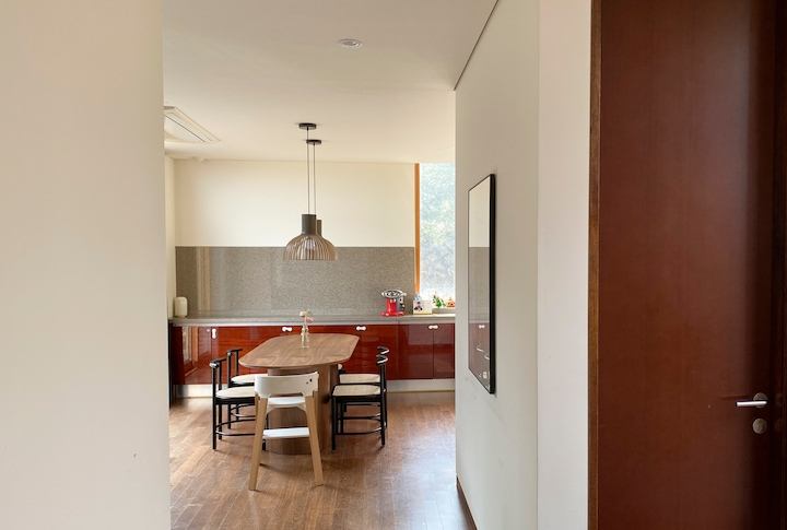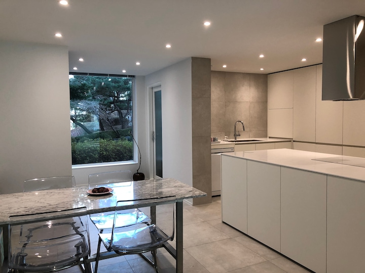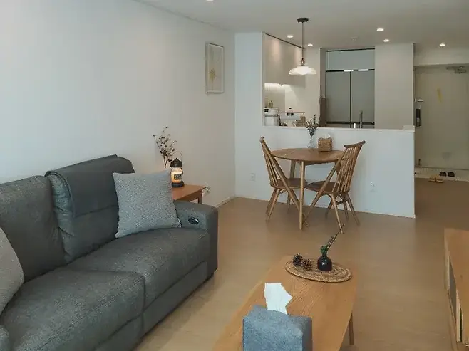 특히 거실과 주방 분리에 많은 공을 들였습니다. 적절한 공간 분리는 같은 공간을 더 넓어 보이는 효과를 줍니다. 거실과 주방 사이에 가벽을 세워서 각각의 공간을 연출했어요. 개방 된 조리대 덕분에 TV나 베란다 바깥을 보며 주방 일을 할 수 있게 되어 무료하지않게 되었습니다. 가벽 넘어에는 원형 식탁을 배치해서 식사 공간을 마련하고 홈카페같은 분위기를 연출했습니다.