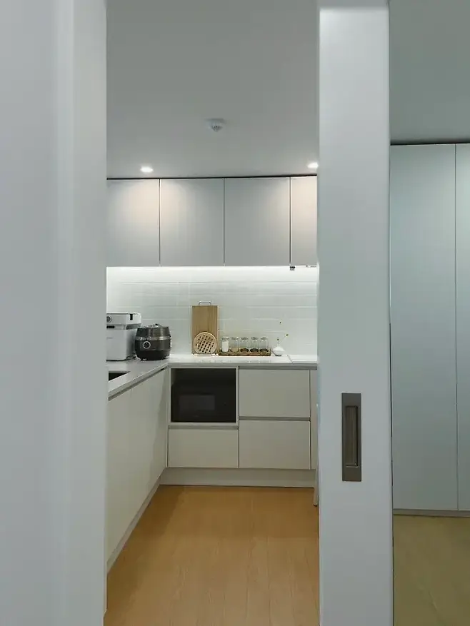 좁은 주방 공간의 활용도를 높이기 위해 아일랜드 식탁 대신 조리대를 따라 모든 곳에 상 하부 장을 만들었고, 전자레인지 같은 부피가 큰 가전은 하부 장에 넣어서 조리대 공간을 확보했습니다. 그리고 대부분의 도구들을 주방 가구에 수납해서 보이지 않게 감추고나니 청소에 용이하고 더욱 깔끔하고 넓어보이는 효과를 얻었습니다.