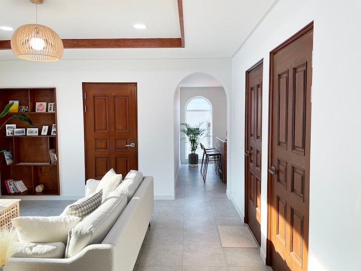 신혼집에서 사용하던 기존 원목 가구들에 잘 어울리는 집을 만들기 위해, 그리고 낡은 집을 완전히 탈바꿈하기 위해 전체 리모델링을 진행했습니다. 원목 가구를 받아줄 수 있는 나무색 마루와 페인트 도장 느낌을 주는 화이트톤의 벽지, 창호, 몰딩을 메인 테마로 디자인 했습니다.