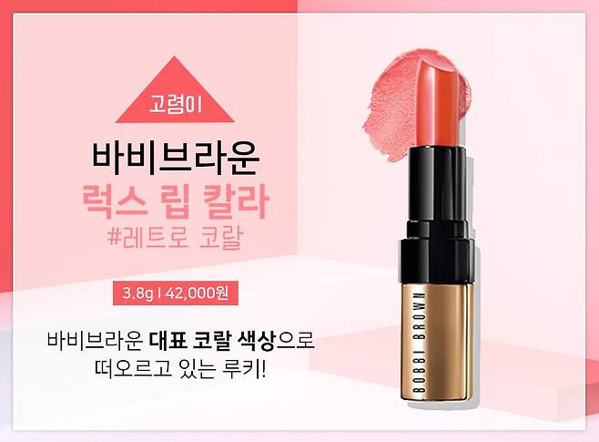 바비브라운은 수분감 가득한 텍스처로, 립밤 없이도 입술에 부드럽게 안착하는 제품이에요. 철쭉처럼 진한 느낌을 줘 코랄이지만 분위기 있는 룩을 연출할 수 있죠. 그래서 평소 코랄의 정석이 약간 부담스러웠던 분들에게 추천드려요.