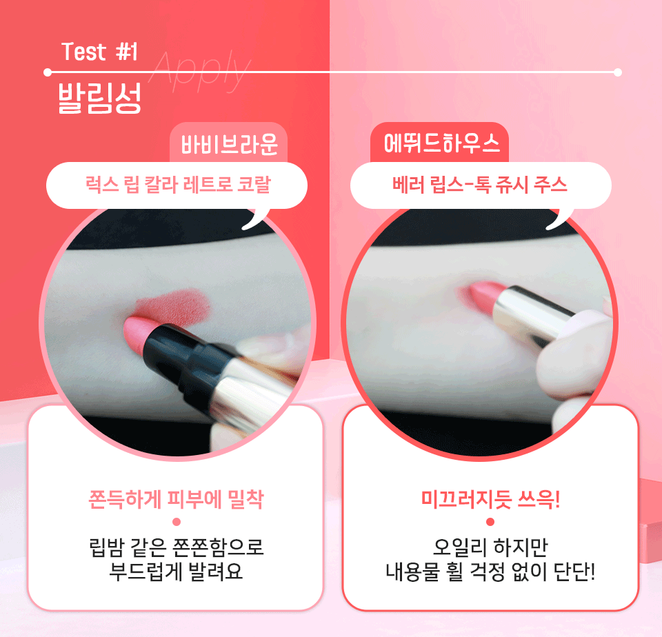 두 제품 모두 촉촉한 텍스처로 발림성이 매우 부드러웠어요! 다만 바비브라운은 조금 더 쫀쫀한 제형으로 매끈하게 발리면서 피부에 밀착했어요. 엄청 단단한 립밤을 바르는 것 같은 느낌이었답니다.