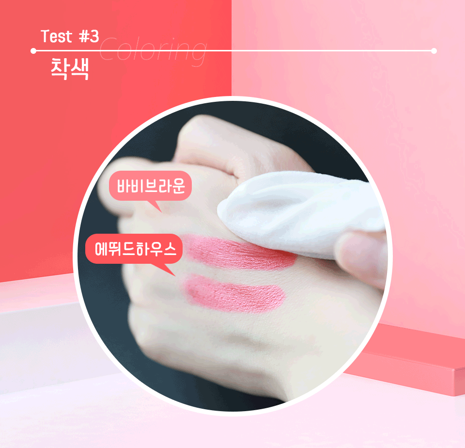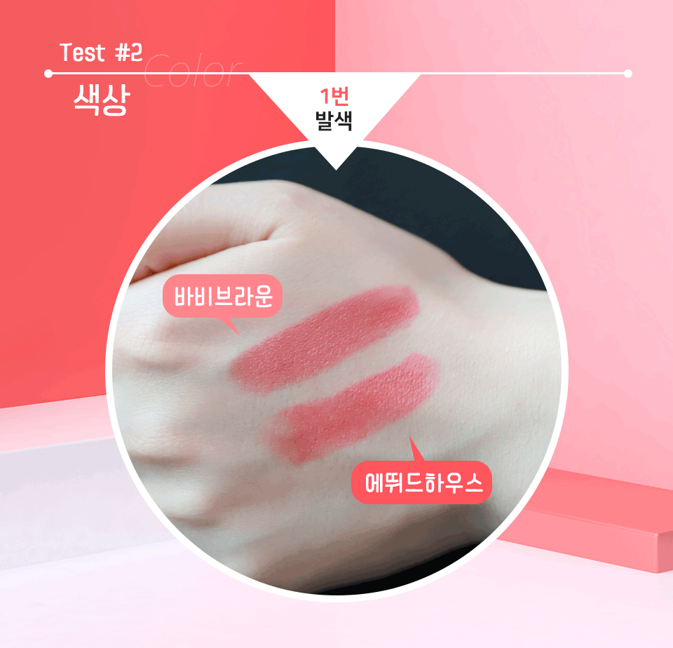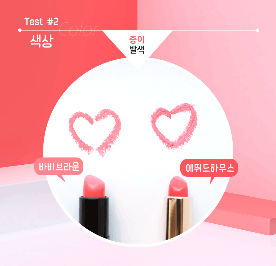 보다 더 정확한 색상 비교를 위해 하얀 종이에 발색을 해보았는데요. 손등 발색과 비슷한 결과를 보여주었어요. 바비브라운은 차분한 느낌을, 에뛰드하우스는 발랄한 낌을 주는 코랄 색상이었죠.