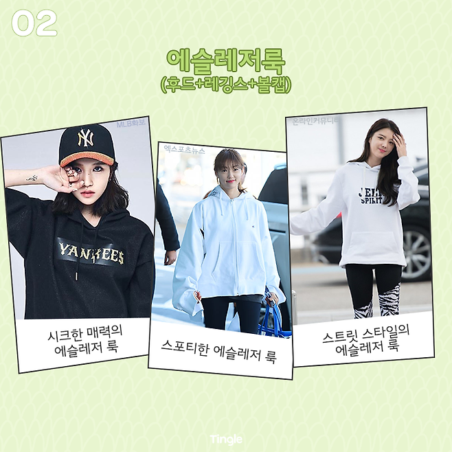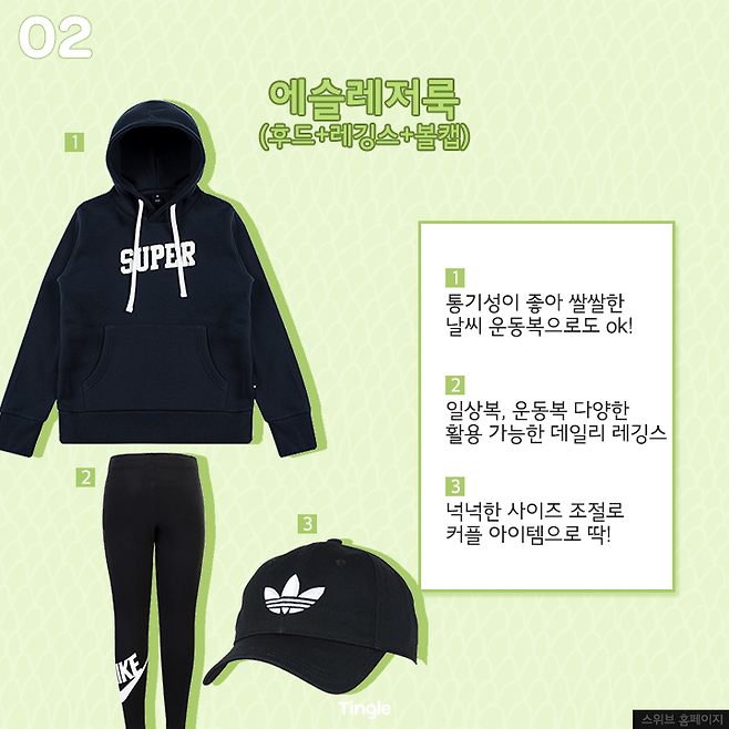편안함이 중심이 되는 에슬레저룩을 원한다면 후드와 레깅스를 함께 스타일링해보세요~ 운동용으로도 데일리로도 가능한 활용도 높은 스타일링이랍니다!
