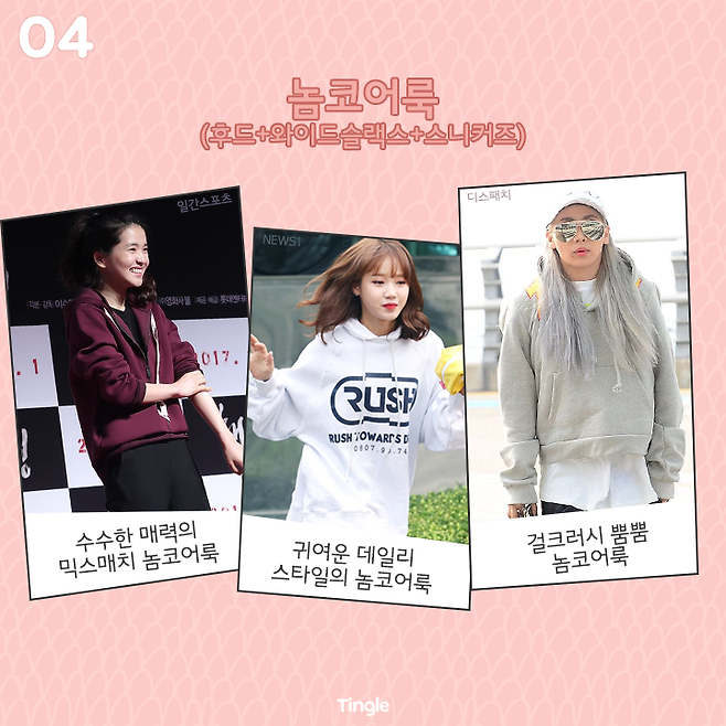 똥꼬발랄함 낭낭한 최유정의 후드를 활용한 귀여운 데일리 놈코어룩! 밑단 티셔츠를 덧 입은듯한 화이트 후드를 원피스처럼 연출해 발랄함을 극대화 시켰어요.