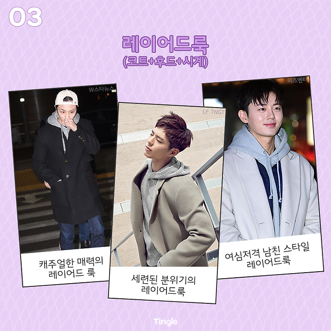 멍뭉미 넘치는 이지훈은 여심저격 레이어드룩을 선보였는데요. 그레이 후드와 밝은 화이트 더블버튼 코트로 패셔너블한 남친룩 완성!