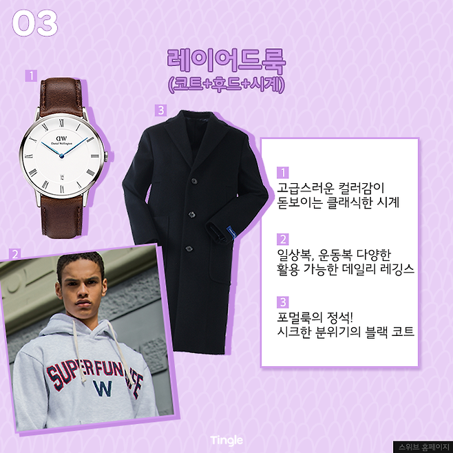 후드와 코트가 안 어울릴 거라는 생각은 버리자! 후드와 코트를 함께 레이어드 한다면 코트의 포멀함과 후드의 편안함이 더해져 센스 있는 레이어드룩 완성!