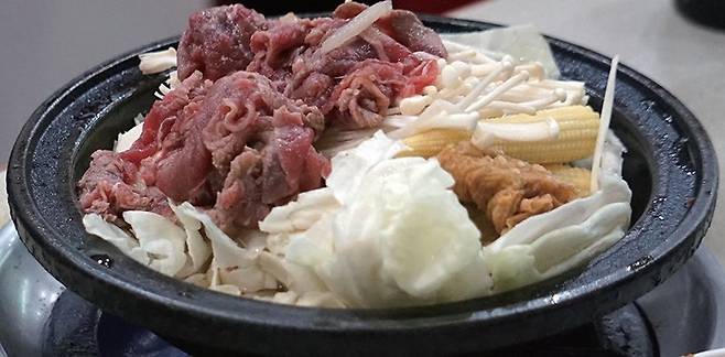 육류를 제외한 다른 재료들은 냉장고에서 직접 선택하면 되는데, 처음에 선택한 재료를 고기와 함께 볶습니다. 재료들이 대충 볶이면 그때서야 육수를 붓습니다.