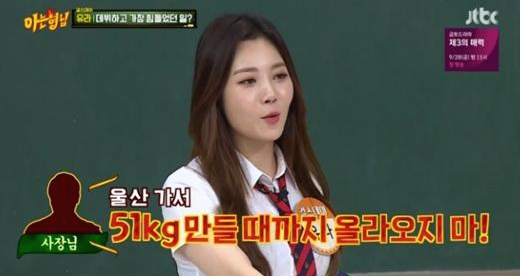 지난 9월 방송된 JTBC '아는형님'에서 유라는 "키가 170cm다. 그때 53kg~54kg 나갔다. 사장님이 51kg까지 빼라고 했다. 소심한 마음에 52kg까지 빼면 안 되냐고 했다. 사장님이 화를 잘 안 내시는 분인데 노발대발 하면서 집에 가서 51kg 만들 때까지 올라오지 말라고 했다"고 밝혔습니다.