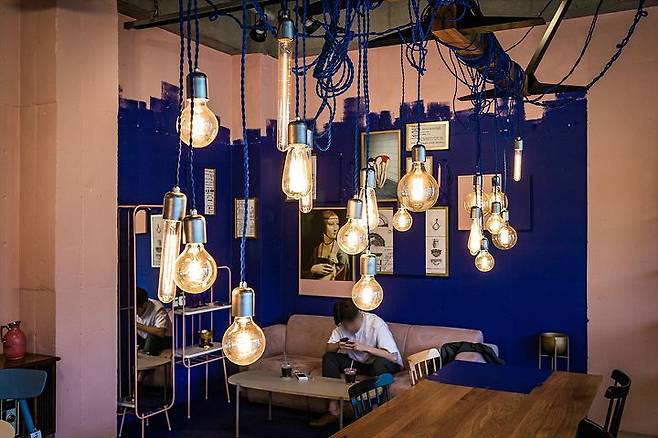 커피숍 인테리어가 굉장히 감각적입니다. 특히 천정에 아무렇게나 감아놓은 듯한 전구 소품들이 독특한 분위기를 만들었습니다. 여기서 매장을 돌아보느라 지친 몸과 마음을 잠시 쉬면서 구입할 가구 선택 의논을 마무리했습니다. 물론 모두 아내의 생각대로…
