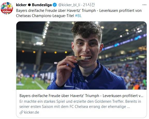 [골닷컴] 김현민 기자 = 첼시가 카이 하베르츠의 결승골로 맨체스터 시티(이하 맨시티)를 꺾고 챔피언스 리그 우승을 차지하면서 하베르츠의 전 소속팀 바이엘 레버쿠젠도 함께 웃었다.