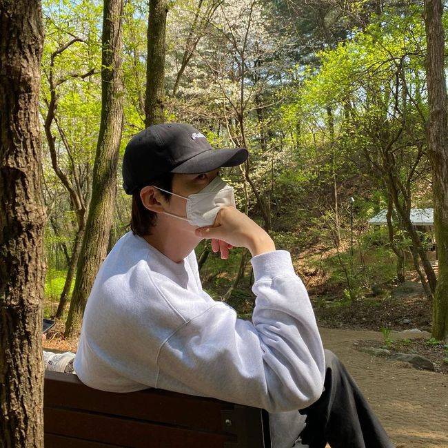 사진에는 김우빈이 숲 속에서 잠시 휴식을 취하며 여유를 즐기고 있는 모습이 담겼다. 모자와 마스크로 얼굴을 가렸지만 눈만으로도 김우빈임을 알 수 있다.