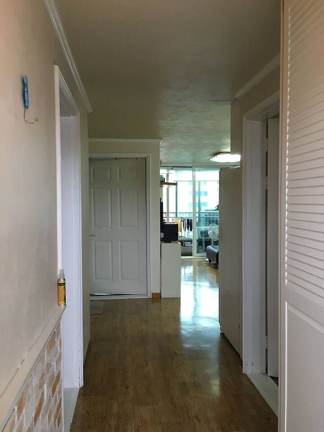 오래된 아파트의 전형적인 구조로 실 주거공간의 평수는 19평 남짓! 다용도실 공간이 따로 없는 작은방 2개, 안방 1개, 화장실 1개의 구조예요.