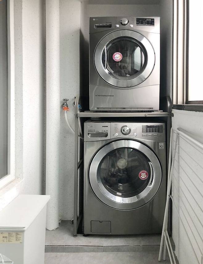 안쪽 베란다 공간에는 드럼세탁기와 건조기, 의류 건조대는 천장에 달려있어 좁은 공간을 최대한 활용했어요.