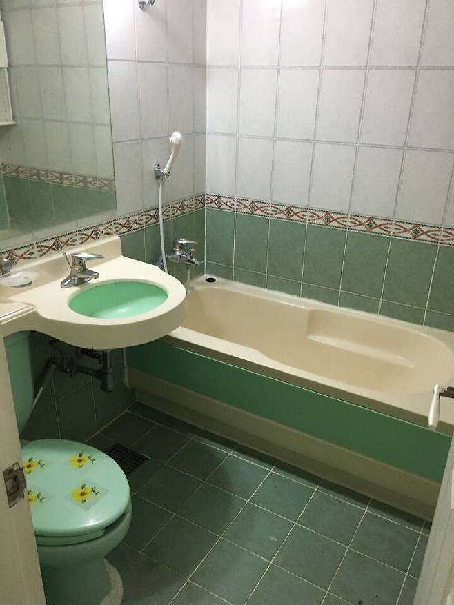 화장실이 가장 갑갑했어요. 옥색 타일, 옥색 세면대에 좁은 공간을 더 좁게 만드는 옥색 욕조. 이게 욕실인지, 옥실인지...